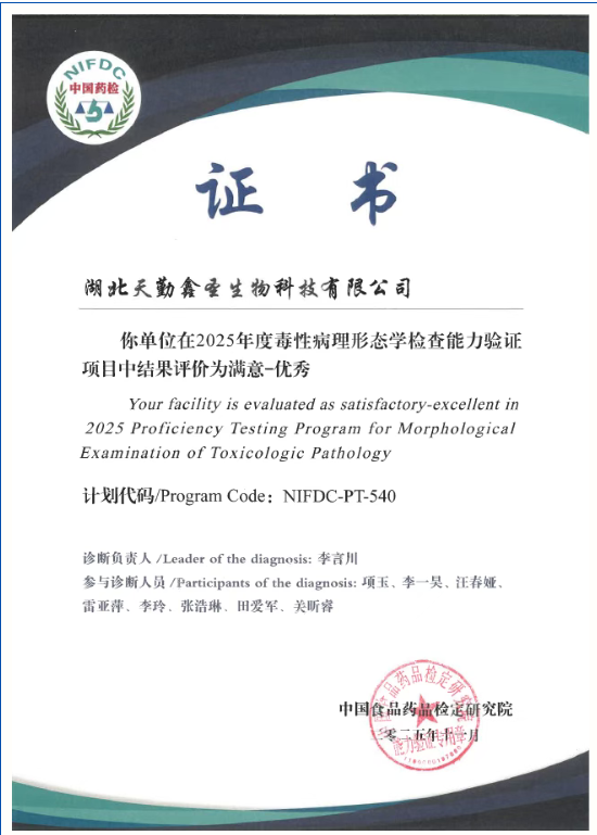 毒性病理形态学检查是药物临床前毒理学评价的重要环节。为在毒性病理诊断领域持续保持高水平,天勤生物全资子公司湖北天勤鑫圣生物科技有限公司(以下称“天勤鑫圣”)参加了由中国食品药品检定研究院组织的2025年度毒性病理形态学检查能力验证项目(NIFDC-PT-540),结果评价再次荣获“优秀”。