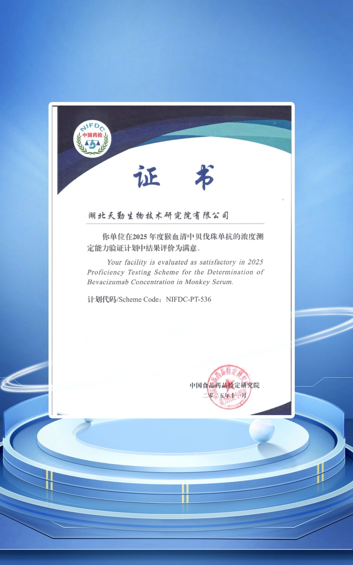 近日,天勤生物核心研发机构天勤研究院(以下称“天勤研究院”)在中国食品药品检定研究院(以下称“中检院”)组织开展的 “2025年度猴血清中贝伐珠单抗的浓度测定能力验证”(计划代码:NIFDC-PT-536)中,全部样本检测结果准确,结果评价为 “满意”。 中检院组织的能力验证计划是国内最具权威性的实验室能力评价体系之一。该计划通过统一发放盲样、实验室独立检测并上报结果、与标准值进行科学比对的方式,客观评价实验室的检测水平。参与并通过此类能力验证,不仅是实验室对外证明自身技术实力的重要途径,更能促进技术交流,监督并持续改进检测水平,是对实验室涉及的分析体系、专业人员、方法流程及仪器设备的一次系统性核准与确认。 本次能力验证计划旨在评估各机构在复杂生物样本中药物浓度测定的准确性与可靠性。贝伐珠单抗作为一种重要的生物制剂,其在非人灵长类动物血清中的浓度测定,对药物代谢研究、临床前安全性评价及药效学分析具有重要意义。 天勤研究院配备了专业的生物分析团队,建立并优化了高灵敏、高特异的定量分析方法,对中检院提供的5个盲态猴血清样本中的贝伐珠单抗浓度进行了精准测定。...