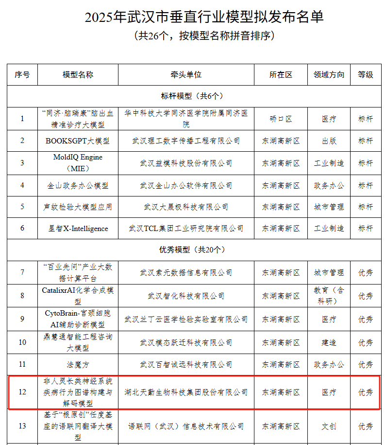 天勤生物行为图谱解码模型入选2025武汉市优秀垂直模型
